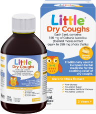 Dry coughs can be eased with Little Dry Coughs. It contains Iceland moss, traditionally used in European herbal medicine to relieve throat irritation and dry coughs. It can help by forming a layer of moisture over irritated and damaged mucosa of the mouth and throat. This soothes the irritated mucous membrane and mitigates the urge to cough.
